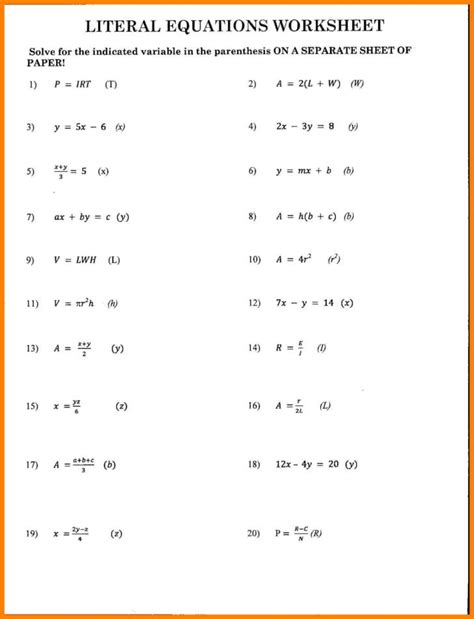 A literal equations worksheet answer key is an invaluable tool for teachers and students alike. This type of worksheet helps to ensure accuracy when solving literal equations, and provides a convenient reference for both the teacher and student.