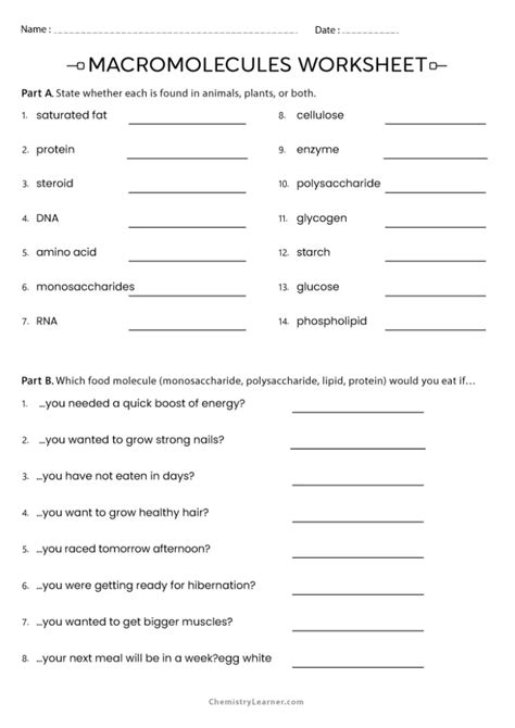 The worksheet also provides an overview of the different kinds of macromolecules, such as monosaccharides, disaccharides, and polysaccharides. It also discusses the differences between saturated and unsaturated fatty acids, the formation of proteins and their role in metabolism, and the structure of nucleic acids.