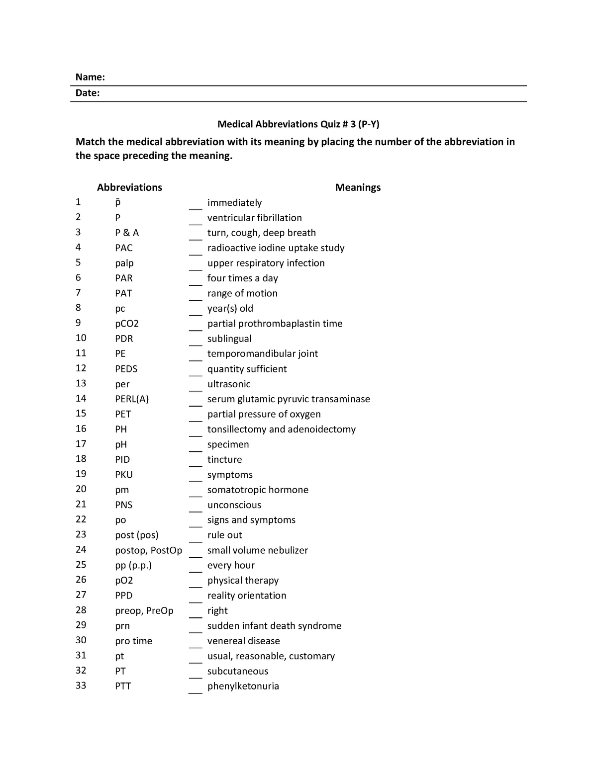 Medical Abbreviations Quiz Printable In Medical Terminology Abbreviations Worksheet
