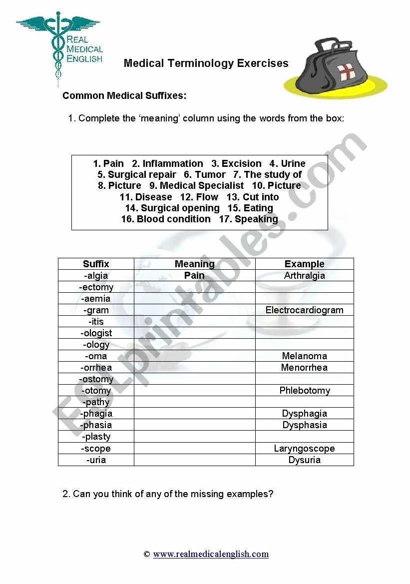 Medical terminology is a complex and specialized language used by health care professionals that includes a variety of suffixes. Knowing the various suffixes and their meanings can be a great help in understanding medical terminology. This step-by-step worksheet guide will provide you with the information you need to understand medical terminology suffixes.