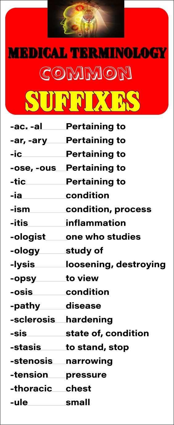 Medical terminology can be a difficult language to learn and master. There are many suffixes used in medical terminology that can help you determine the meaning of a word. Here are 10 of the most commonly used medical terminology suffixes and their meanings: