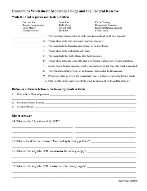 Next, the worksheet examines the impact of changes in the money supply and interest rates on economic output. An increase in the money supply generally leads to an increase in economic output, as more money is available for businesses to invest and expand. Conversely, an increase in interest rates often leads to a decrease in economic output, as businesses find it more expensive to borrow money.
