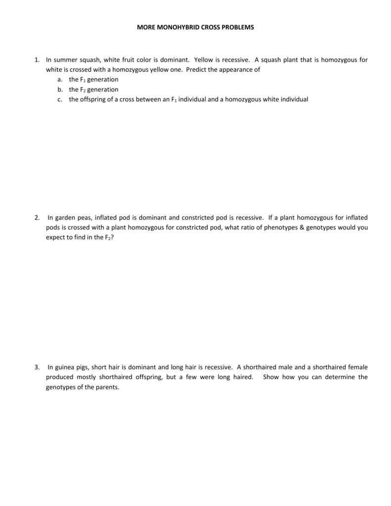 Monohybrid cross practice problems worksheets offer a number of benefits for students. First, they provide a more engaging and interactive way to learn about monohybrid crosses than simply reading from a textbook. By working through the problems and applying their knowledge, students can gain a better understanding of the concepts and processes involved in monohybrid crosses. Additionally, these worksheets can help students to better visualize the results of genetic crosses and see how different combinations of alleles can lead to different phenotypes in offspring.