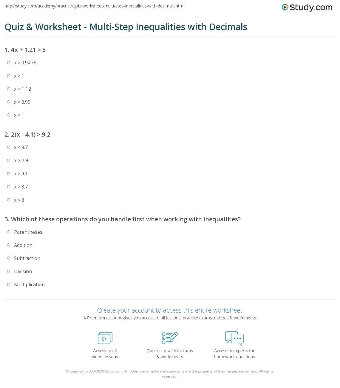 Quiz & Worksheet - Multi Step Inequalities With Decimals | Study With Regard To Multi Step Inequalities Worksheet