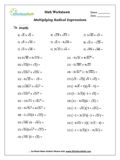 A multiplying radical expressions worksheet can be a valuable tool for reinforcing math concepts. Here are some creative ways to use such a worksheet to help students understand and apply the concepts:
