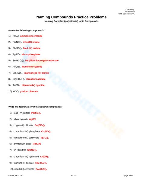 The worksheets typically contain a variety of practice problems that allow students to become familiar with the different types of compounds, how to name them correctly, and how to correctly write the chemical formulas for each compound.