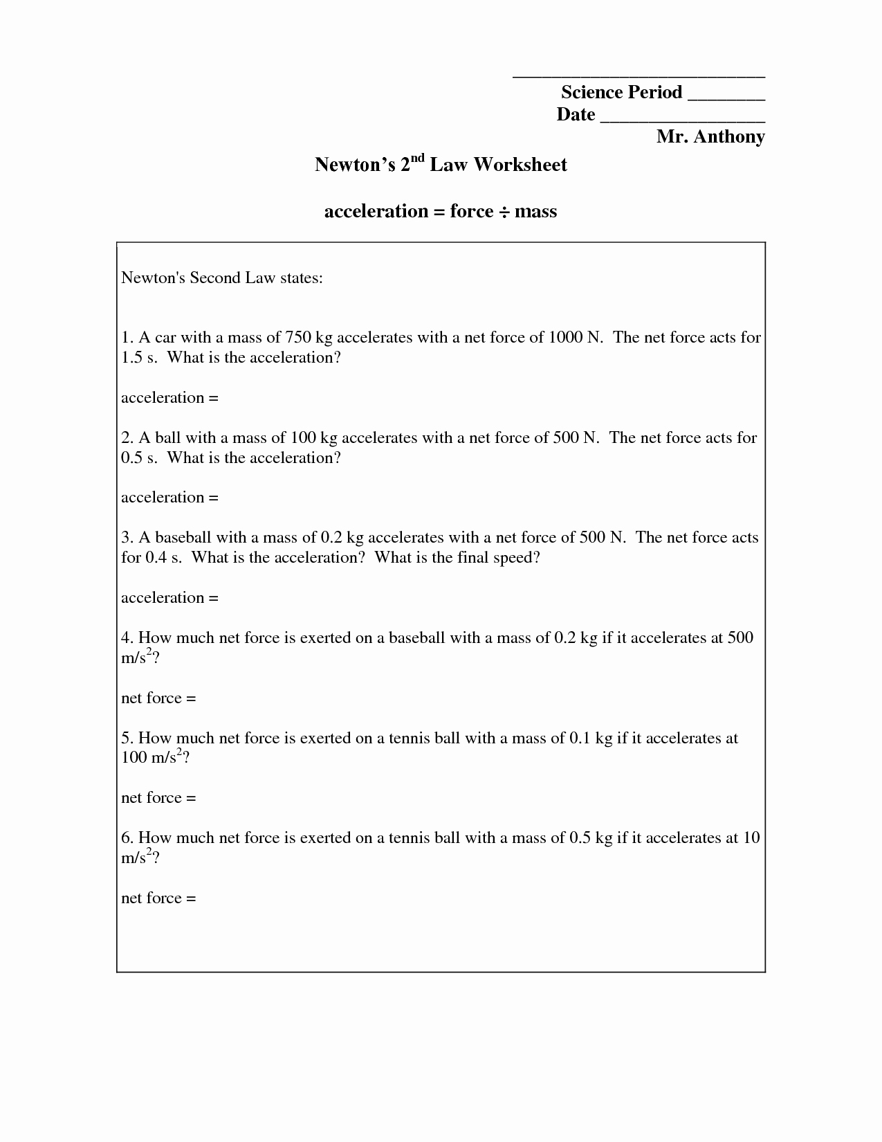 The worksheet begins by asking students to identify the equation which explains Newton’s Second Law. It then explains that the acceleration of an object is proportional to the net force acting on it. It also explains that the acceleration is inversely proportional to the mass of the object. This is an important concept as it means that a force applied to a more massive object will result in a smaller acceleration than the same force applied to a less massive object.