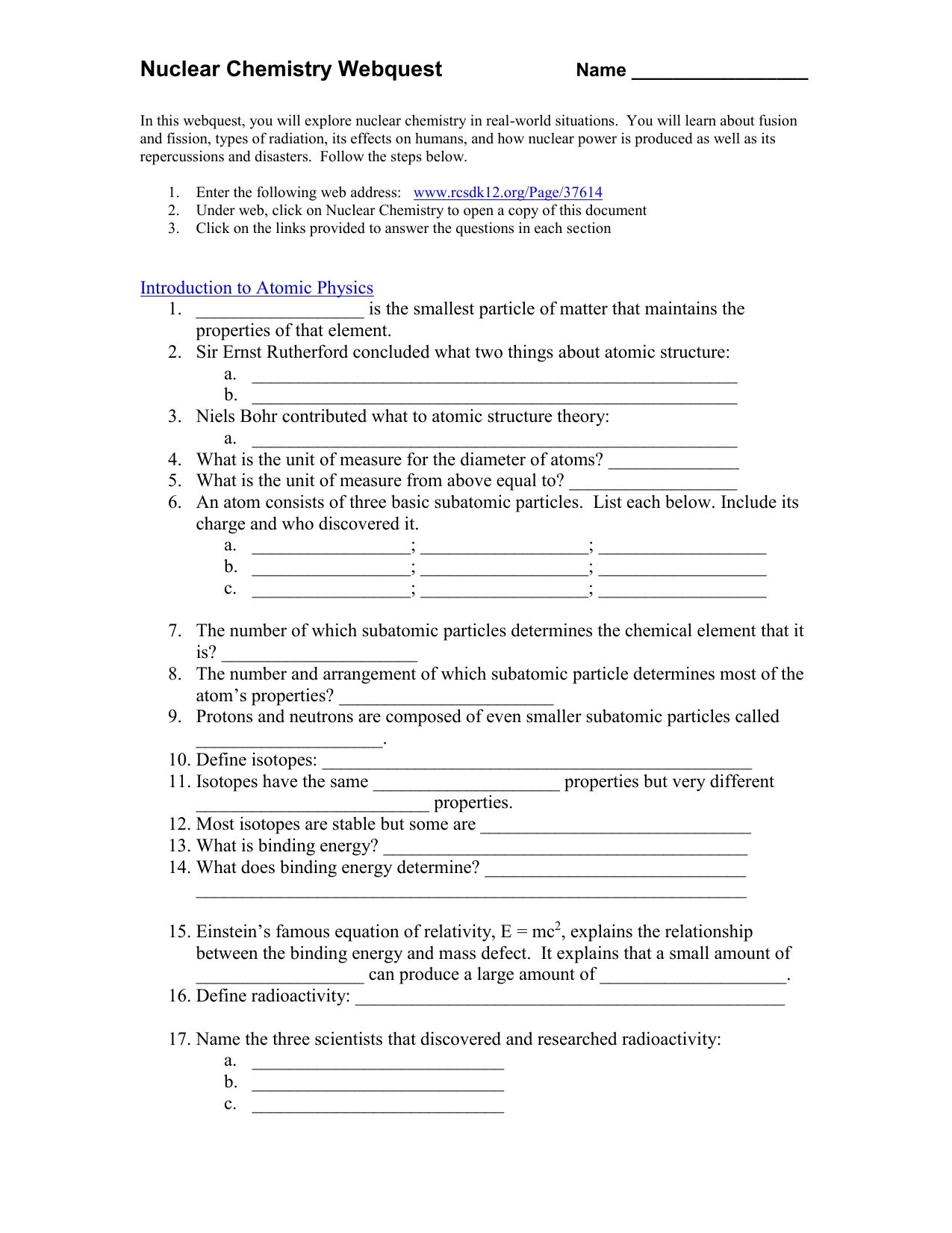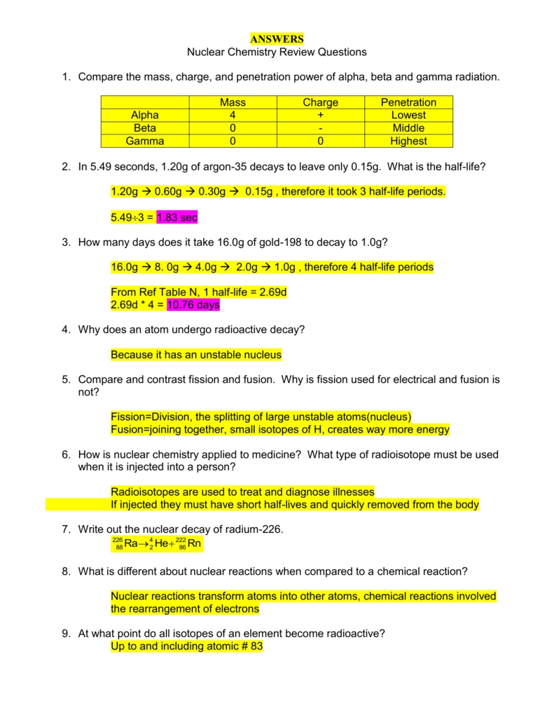 Nuclear Chemistry Worksheet Answer Key