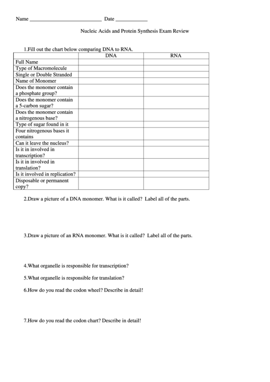 The worksheet begins with an introduction to the structure and components of DNA and RNA. It explains the differences between the two, including the structure of the sugar-phosphate backbone, the four nitrogenous bases, and the paired hydrogen bonds that link the strands of DNA. It also covers the differences between the three types of RNA and the properties of each.