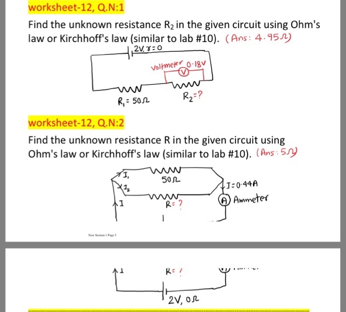 For example, the worksheet may ask the user to calculate the current through a resistor when a voltage is applied across it. In this case, the user would first need to determine the resistance of the resistor. Once the resistance has been calculated, the user can use the equation V=IR, where I is the current, V is the voltage, and R is the resistance, to calculate the current through the resistor.