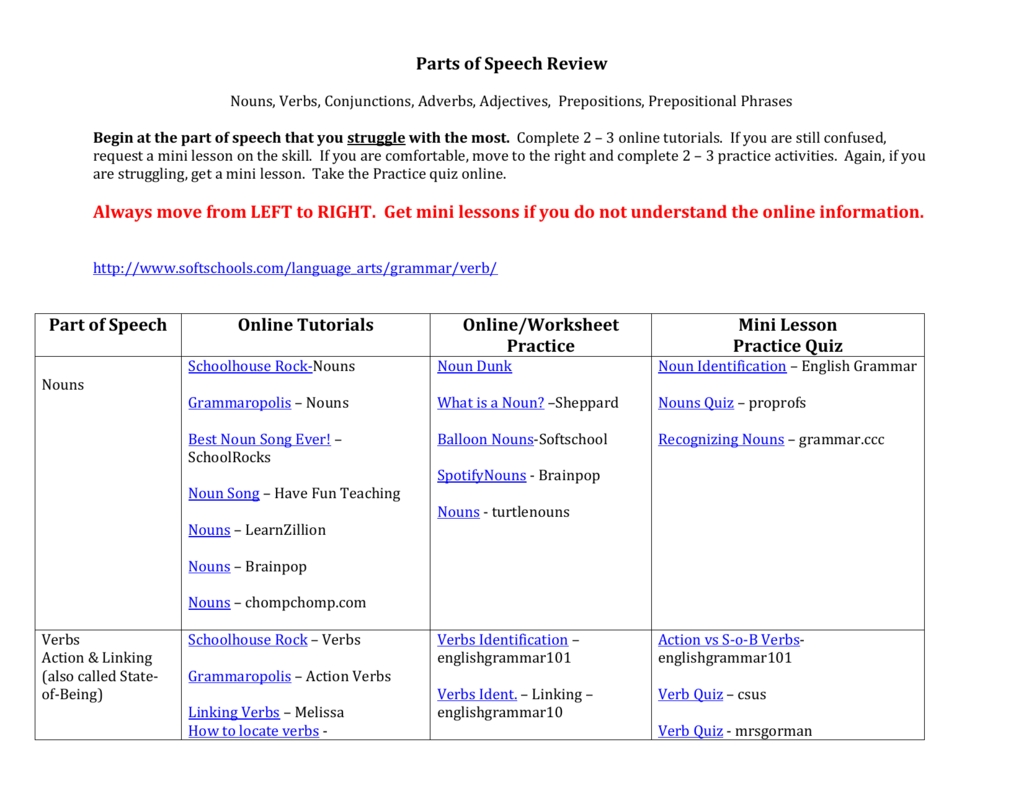 Parts Of Speech Review Worksheet