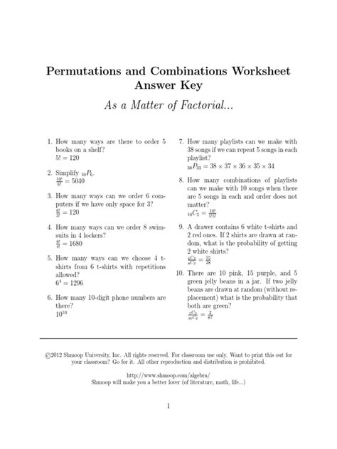 Permutations and combinations worksheets are a valuable resource for teachers looking to incorporate more mathematics into their classrooms. By utilizing these worksheets, teachers can provide students with an opportunity to expand their understanding of mathematics and enhance their problem-solving abilities.