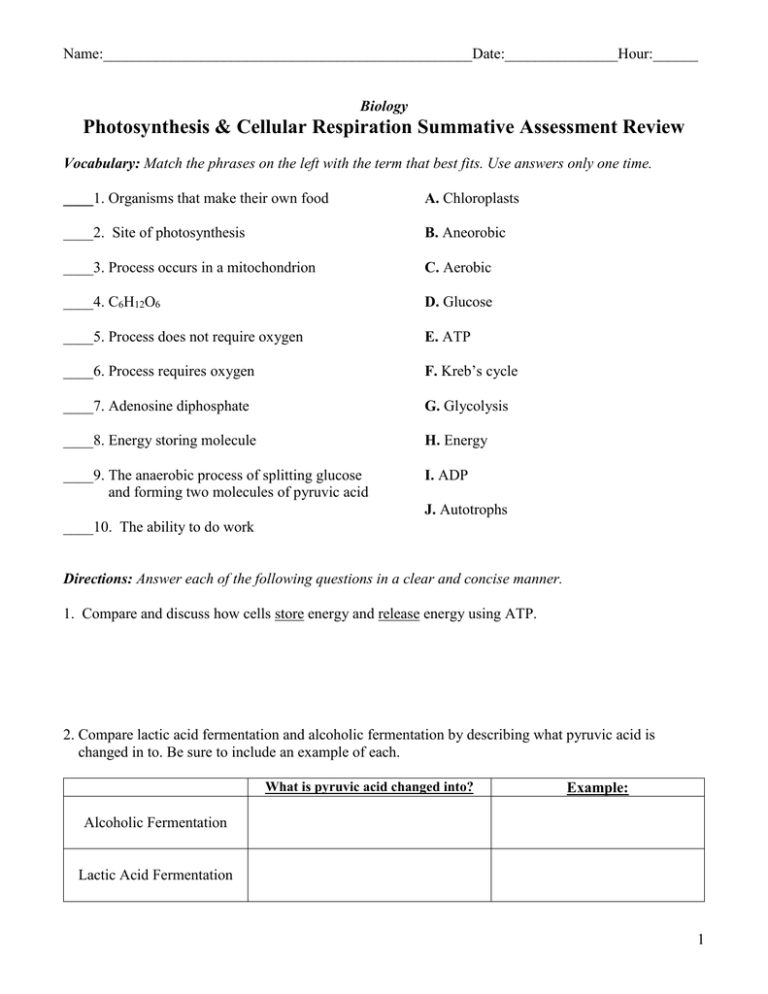 This worksheet will consist of a series of questions and activities designed to test students’ understanding of photosynthesis and cellular respiration. The questions will require students to demonstrate their knowledge of the processes, as well as their ability to apply this knowledge to real-world situations.