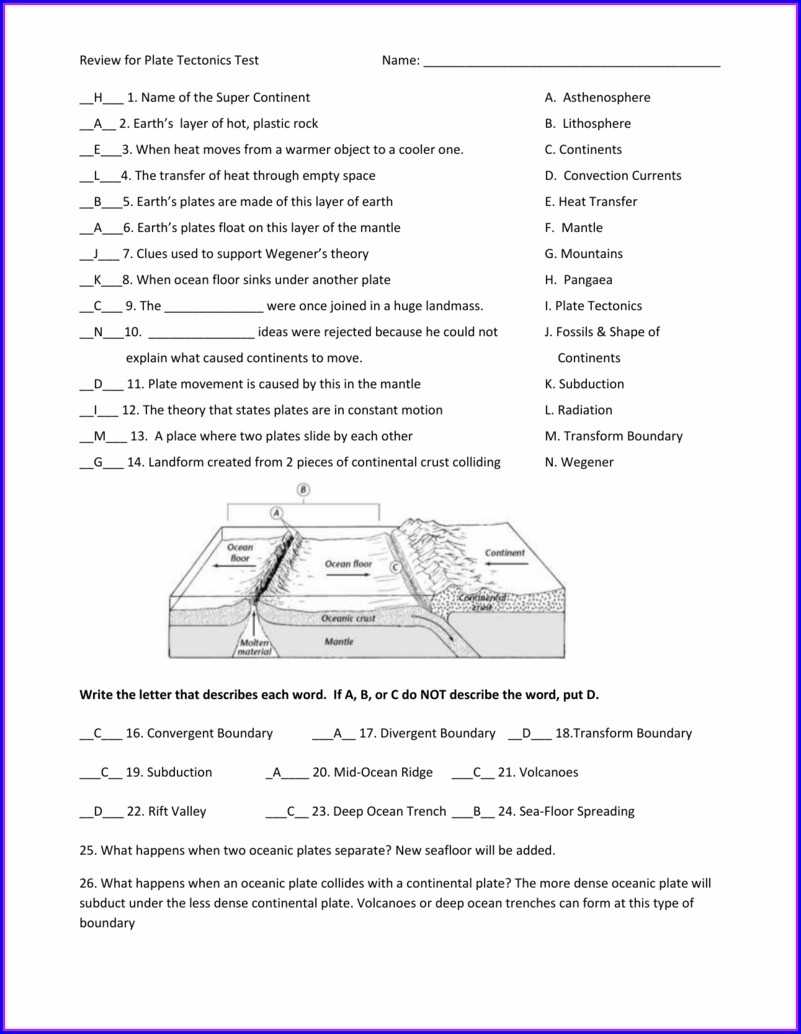 The worksheet should also explain different types of plate boundaries in terms of the forces that drive them. For example, divergent boundaries occur when two plates move away from one another, while convergent boundaries occur when two plates come together. Transform boundaries are where two plates slide horizontally past one another.