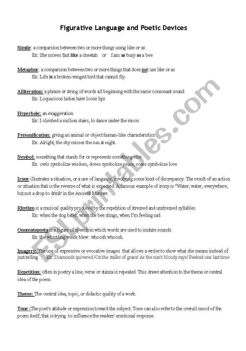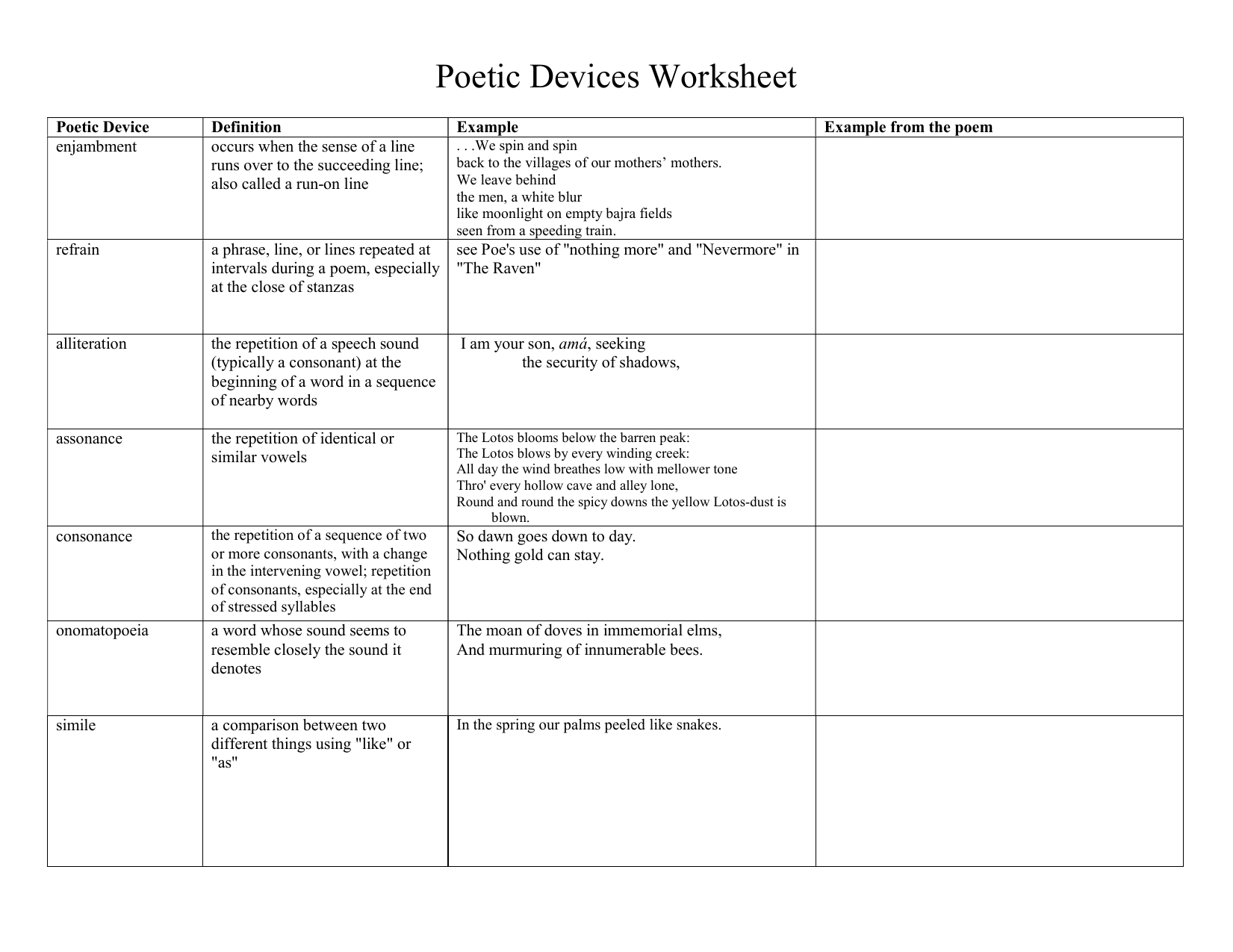 The Poetic Devices Worksheet 1 provides a comprehensive overview of various poetic devices used in literature. It covers different types of metaphors, similes, alliteration, and repetition, as well as other types of figurative language. This worksheet can be used as a valuable reference tool for students and teachers alike. With the help of this worksheet, students can gain a better understanding of the different techniques used in poetry, and can apply them in their own writing.