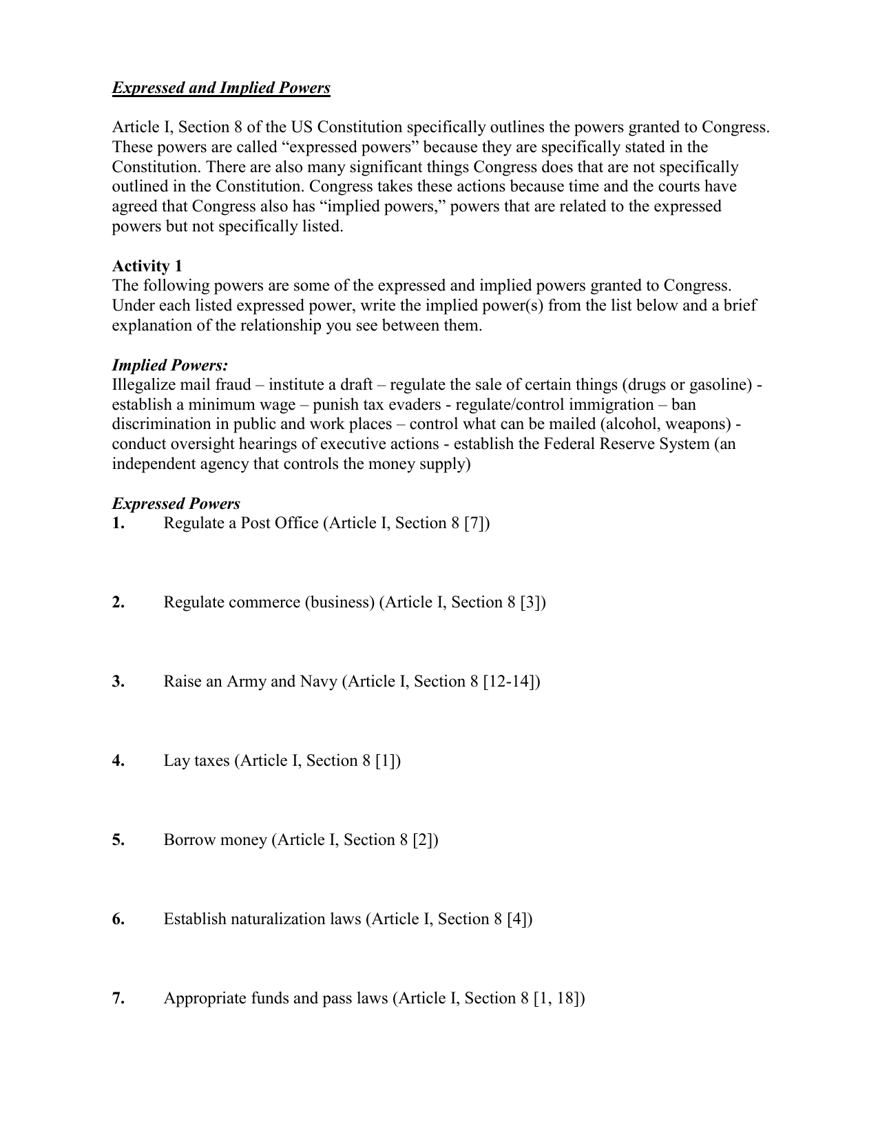 Implied Powers Of Congress Examples - 28 Wedding Decorations Ideas Intended For Powers Of Congress Worksheet
