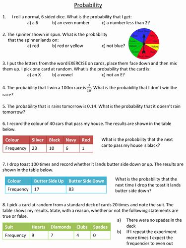 Worksheets can also be useful for helping students understand probability concepts. Worksheets can provide students with practice in calculating the probability of various events. For example, worksheets can include questions asking students to calculate the probability of rolling a certain number on a die or dealing a certain card from a deck. Worksheets can also offer practice in interpreting data to determine the probabilities of various outcomes. By providing students with a range of different worksheets, they can gain a better understanding of probability concepts and be better prepared to apply them in different contexts.