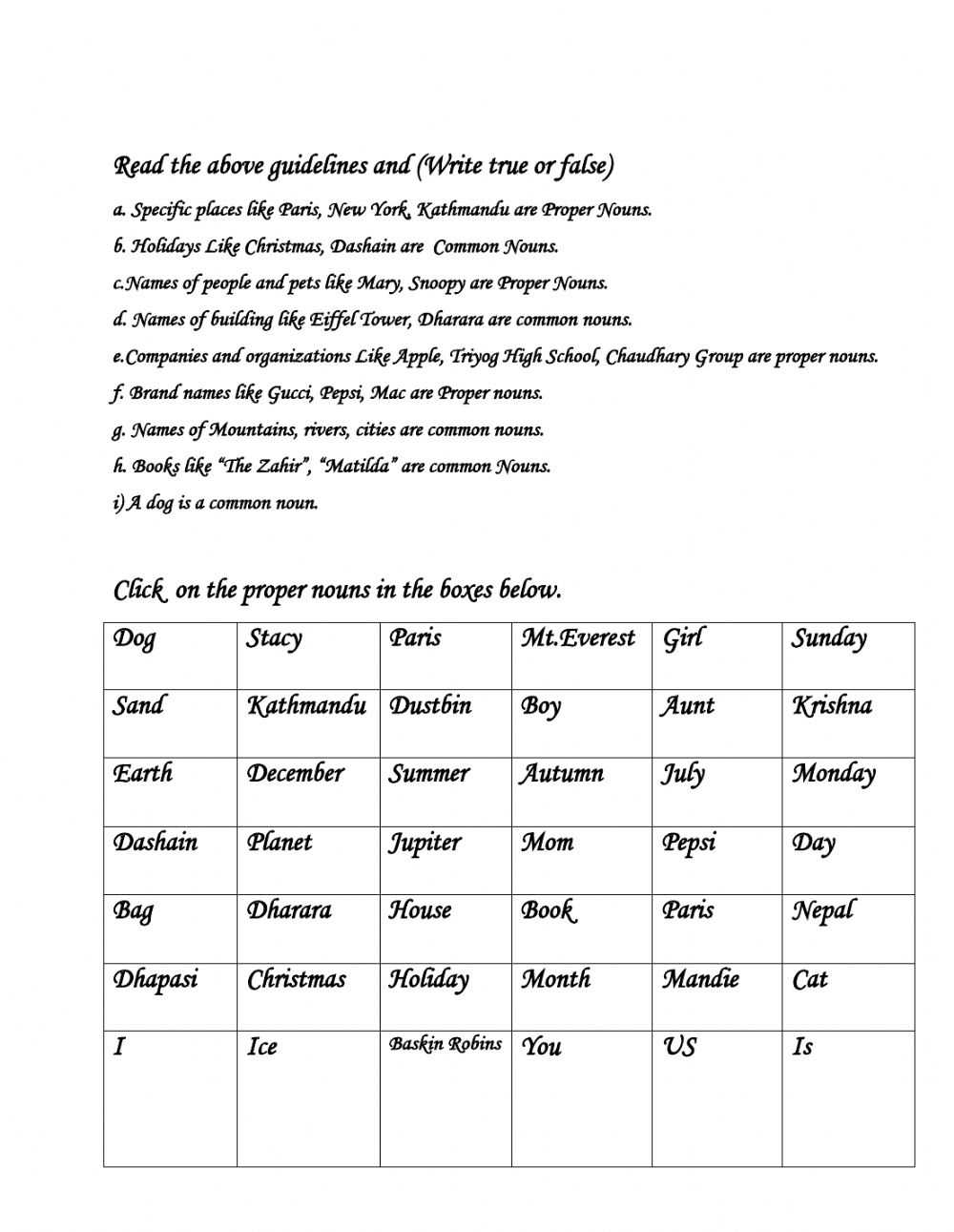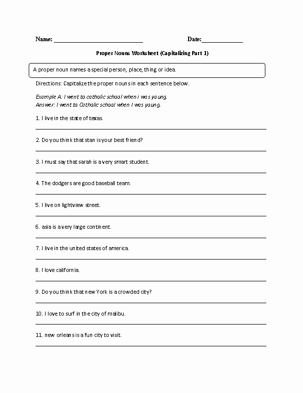 Finally, the worksheet should include a few fill-in-the-blank exercises, in which students will be asked to provide proper nouns for a given sentence. This will help them to understand how proper nouns are used in writing.