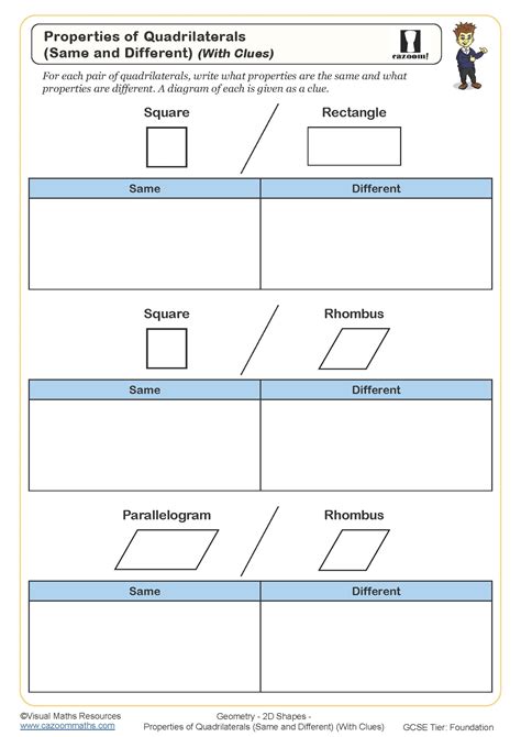 To use properties of quadrilaterals worksheets effectively, teachers should begin by introducing the different types of quadrilaterals and their properties. Once students understand the basic definitions and characteristics of each type, they can then use the worksheets to practice applying the properties. Worksheets typically include questions that require students to identify the type of quadrilateral based on its properties, as well as questions that ask them to use the properties to calculate certain measurements.
