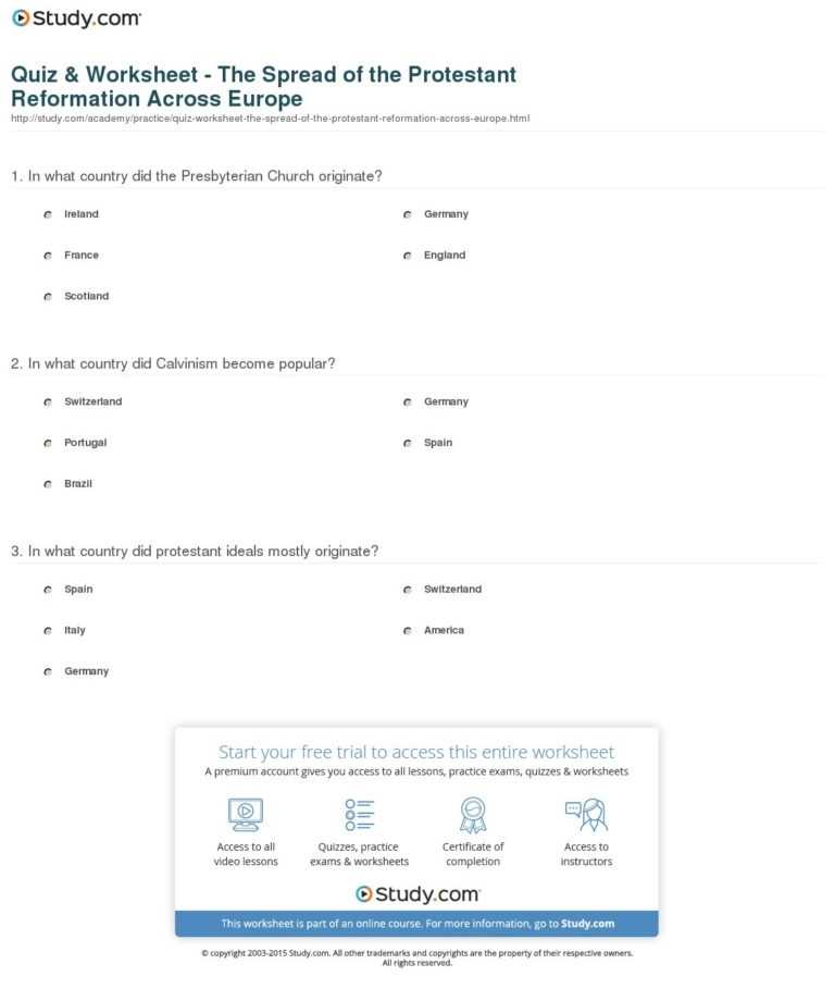 Quiz Worksheet The Spread Of The Protestant Reformation — Db Excel In Protestant Reformation Worksheet Answers