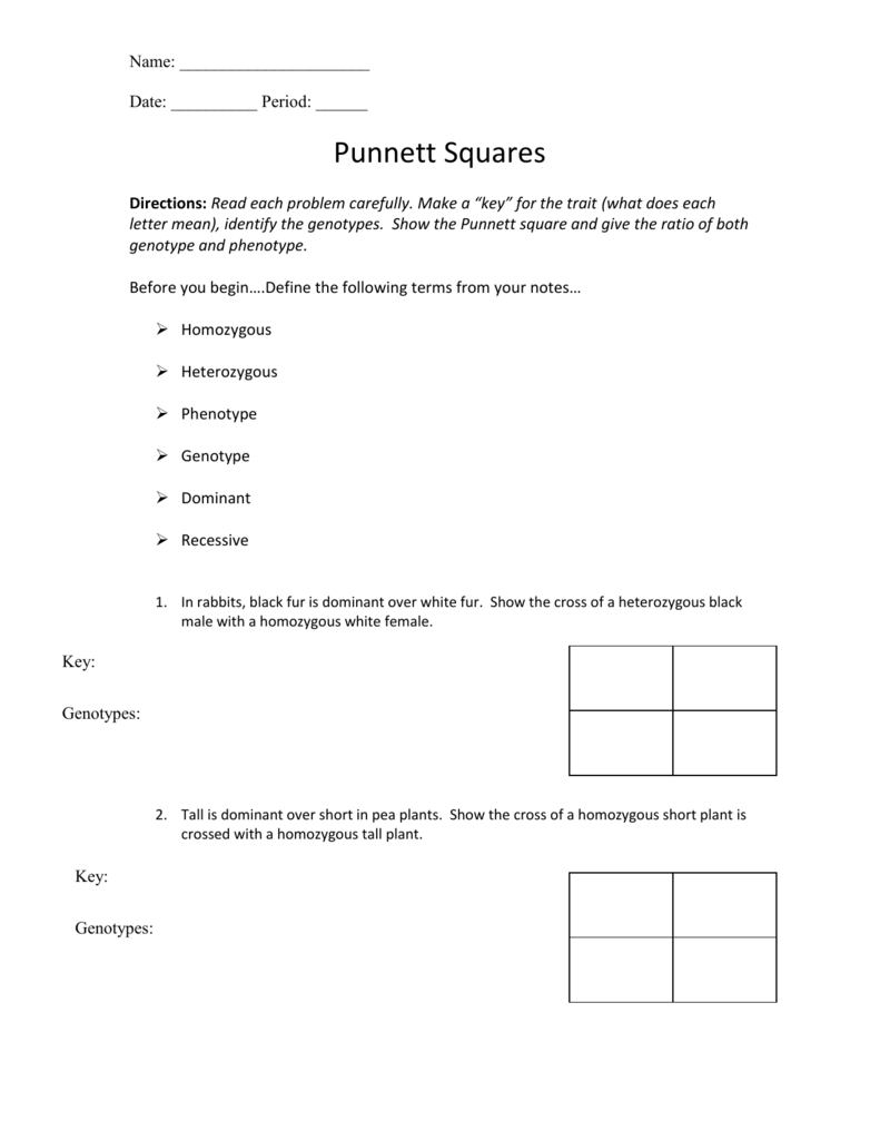 Practice problems worksheets can be a great way to learn how to solve Punnett square problems. These worksheets usually provide a set of problems and the appropriate Punnett squares to solve them. Each problem will provide the genotype of the parents and the desired phenotype or genotype of the offspring. By using the Punnett square provided, you can then calculate the probability of the desired phenotype or genotype appearing in the offspring.