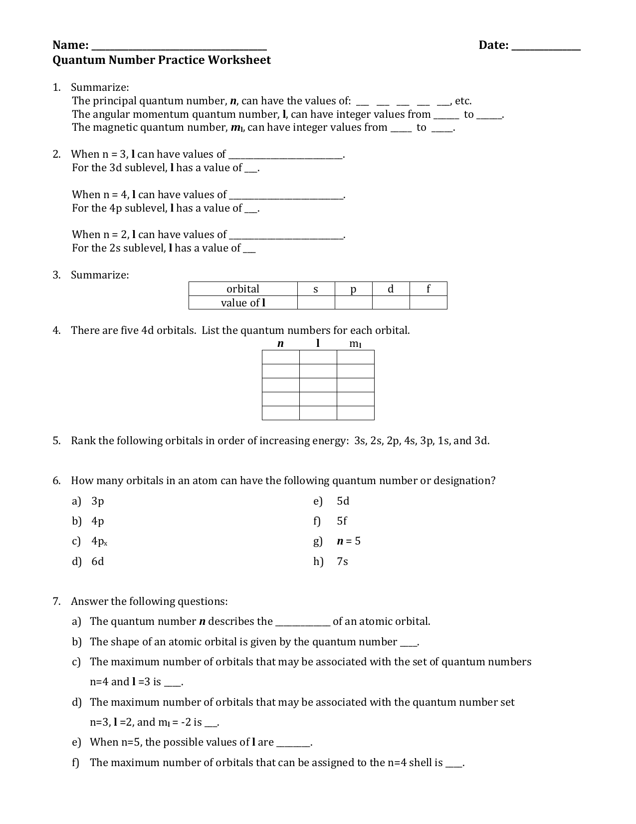 The quantum numbers worksheet should include an overview of the four quantum numbers (principal, angular momentum, magnetic, and spin) and their associated values. It should also provide an explanation of the meaning of each quantum number and how they interact with each other.