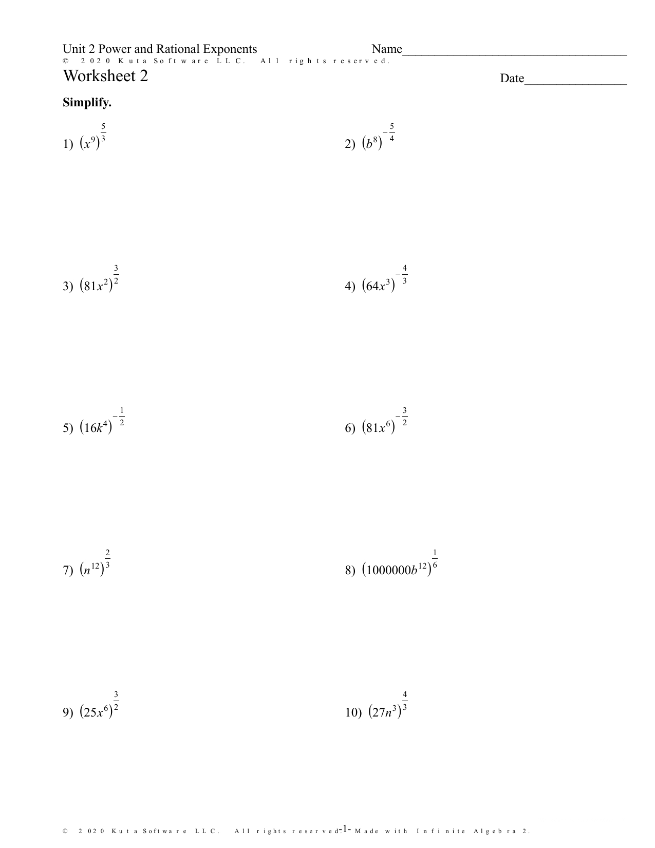 The worksheet also provides several examples and practice problems so that students can test their understanding of the concepts. For example, the worksheet includes several equations with radical and rational exponents. Students are asked to simplify the equations and solve for the value of the exponents. In addition, the worksheet provides several equations with rational or radical exponents that must be solved.