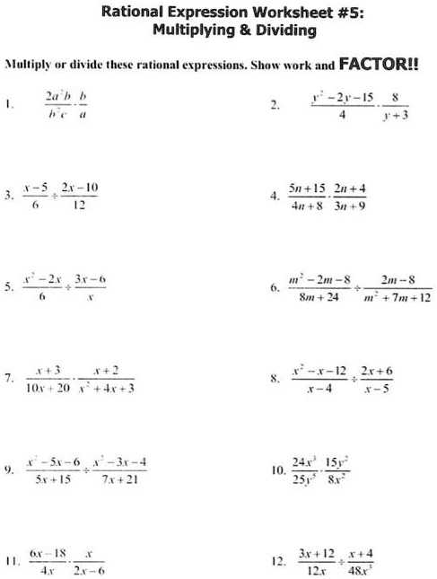 Solving Rational Expressions worksheet questions can be a daunting task, but by breaking down the problem into smaller steps, the process can be simplified. The first step to solving a rational expression is to factor the numerator and denominator. This involves finding common factors that can be divided out from each term, and then breaking the terms into their prime factors. Once the factors have been determined, the greatest common factor of the numerator and denominator can be identified.