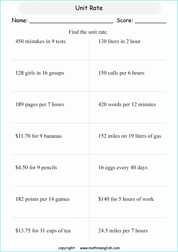 3. Unit Rate Worksheets: These worksheets are designed to help students understand how to calculate rates. They typically involve students writing out a ratio and then solving for a given unit rate.