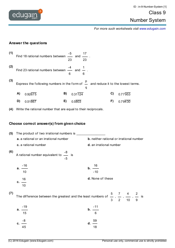 Grade 9 Number System Math Practice Questions Tests Worksheets Quizzes In Real Number System Worksheet