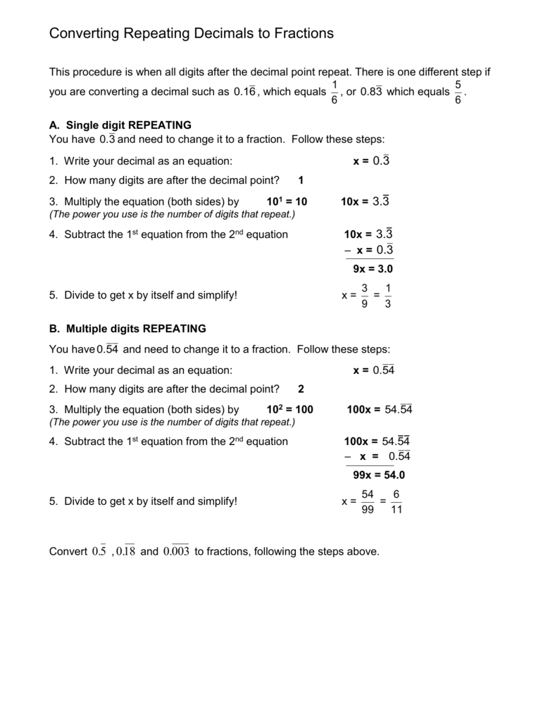 A Repeating Decimal To Fraction Worksheet is an invaluable resource for students of mathematics who are looking to gain a better understanding of the concepts of fractions, decimals, and their interrelationship. This worksheet can help students develop their skills in converting decimals to fractions and vice versa. To get the most out of your worksheet, it is important to understand the structure of the worksheet and how to approach it.