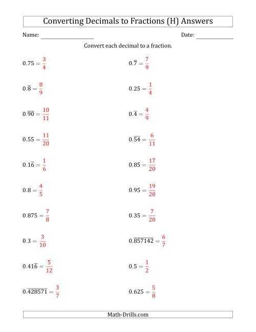 Converting Terminating And Repeating Decimals To Fractions (H) Pertaining To Repeating Decimals To Fractions Worksheet