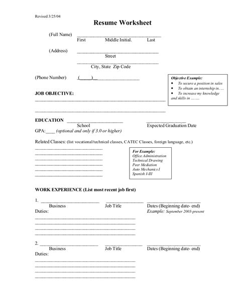 Resume Worksheet For High School Students — Db Excel Throughout Resume Worksheet For Adults