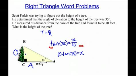 Finally, yet another type of right triangle word problem involves finding the angles of a triangle given the lengths of its sides. Here, the student must use the Pythagorean theorem to calculate the angles of the triangle.