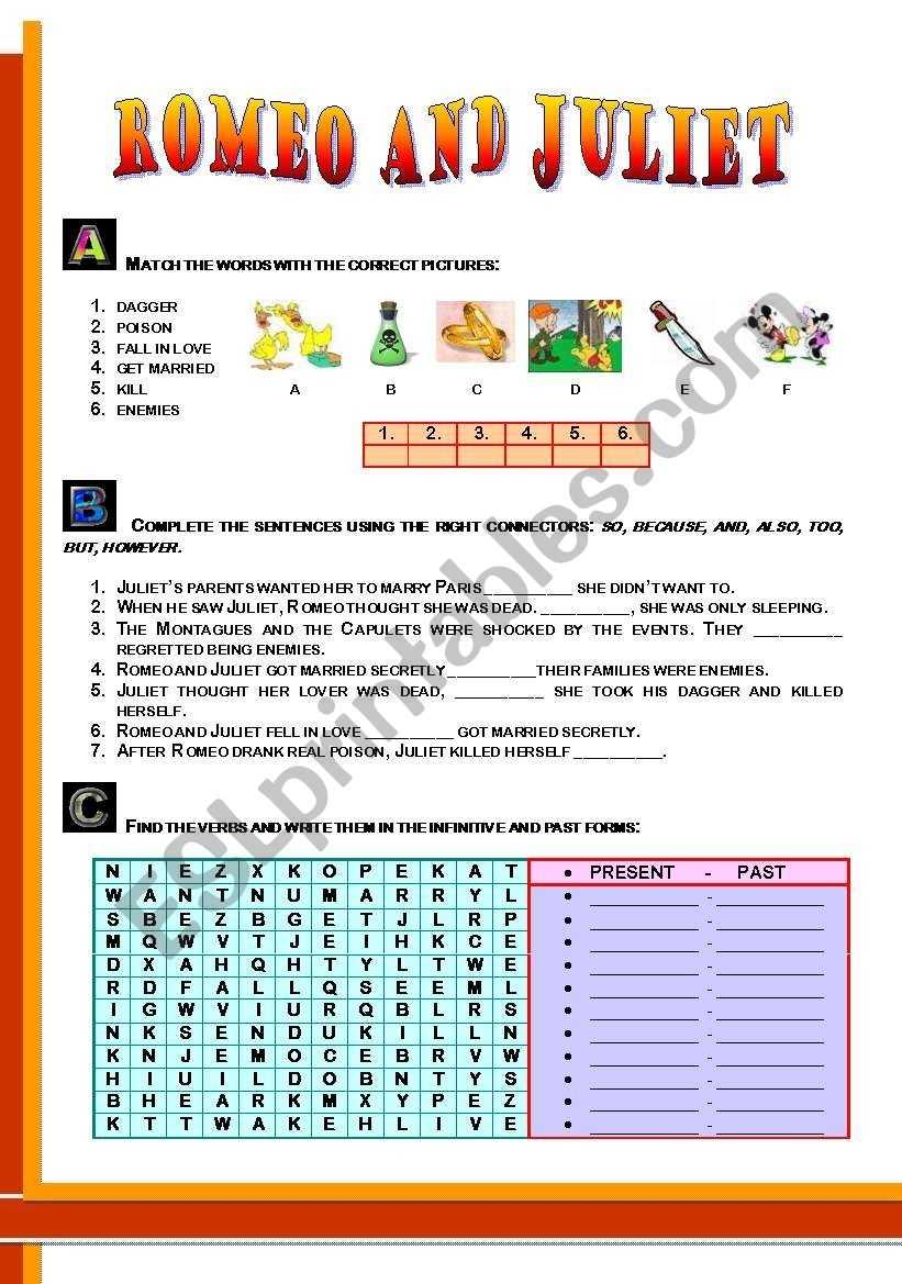 Next, teachers can assign students to read the play and complete Romeo and Juliet worksheets. These worksheets should focus on the themes and characters of the play, and should also ask questions about how the characters handle various conflicts. Questions can include how the characters manage their feelings and how they interact with one another during disagreements.