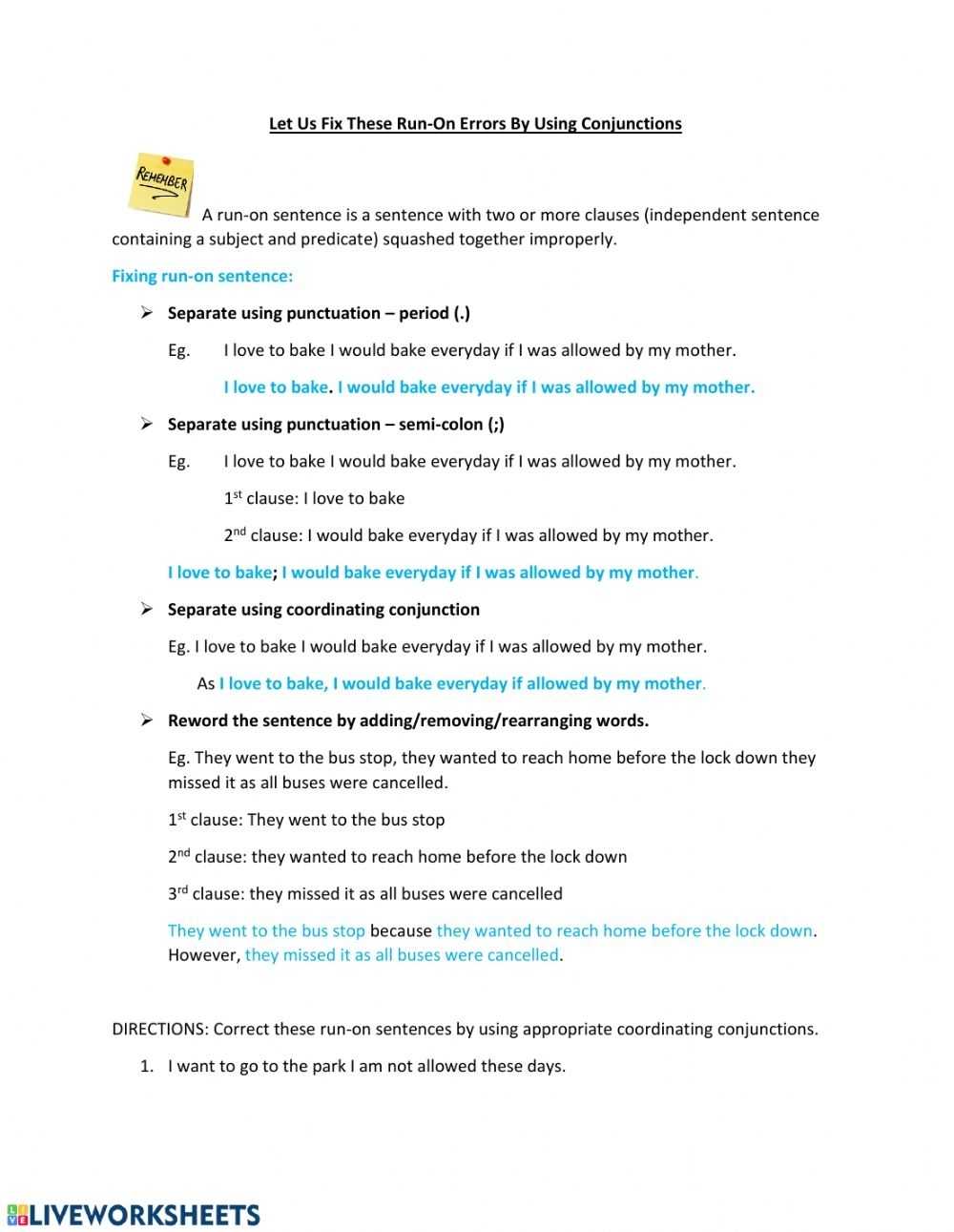 1. Read through the run-on sentence worksheet PDF carefully and make sure you understand the definitions and examples provided.