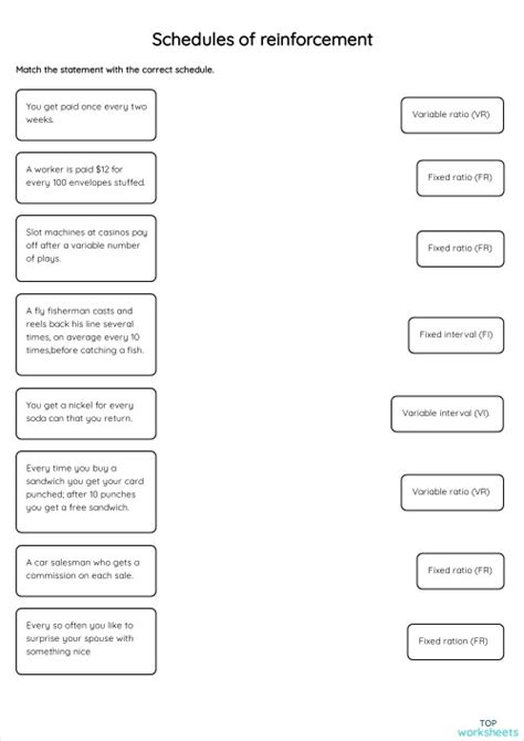 The Schedules Of Reinforcement Worksheet is an invaluable tool when it comes to designing effective reinforcement systems. It provides a clear structure for understanding the different types of reinforcement schedules and how they can be used to promote desired behavior. By understanding the principles of reinforcement and the different schedules, educators and behavior analysts can design reinforcement systems that are effective, efficient, and tailored to the individual needs of their students.