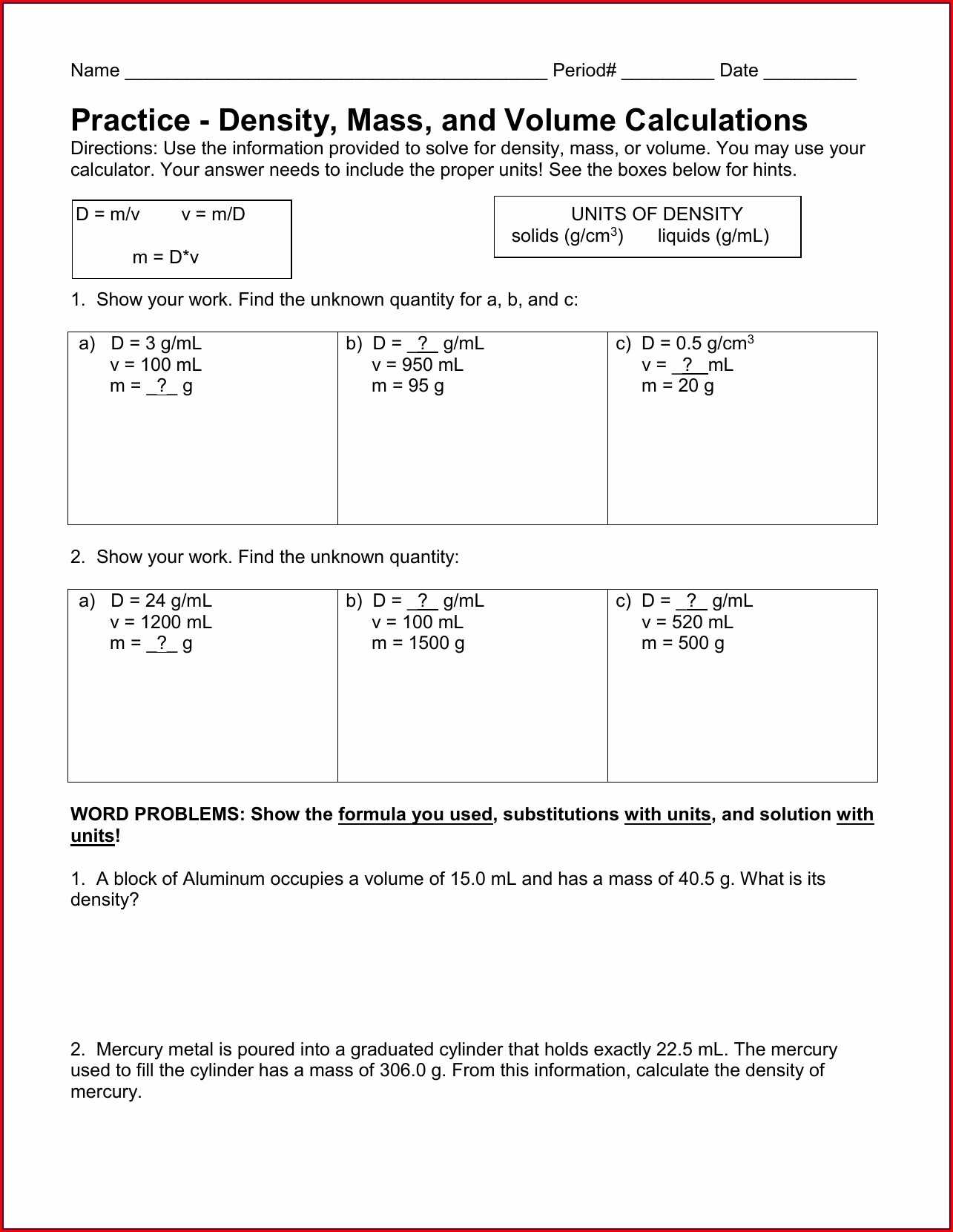 Innovations in Density Calculations Worksheet Design