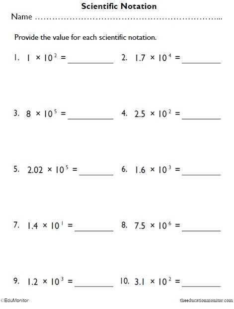 To begin, students should familiarize themselves with the concept of scientific notation. This includes understanding the difference between decimal notation, which is the traditional way of writing numbers, and scientific notation, which expresses the same numbers using powers of 10.