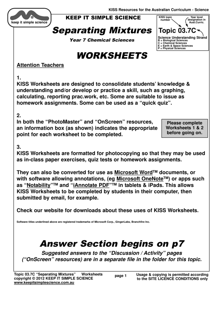 Separating Mixtures Worksheets Answer Section Begins On P7 In Separation Of Mixtures Worksheet