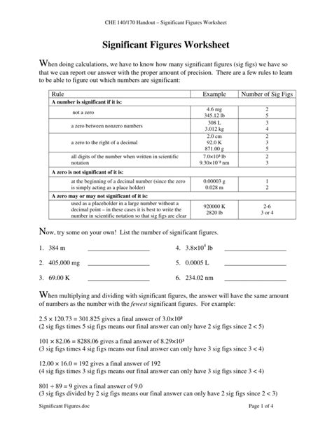 To further enhance student learning, the worksheet should also have questions that require students to apply their knowledge of sig figs to solve problems. These questions should be designed to help students think critically and develop their problem-solving skills. Once students have completed the worksheet, they should be given the answers to the questions so that they can review their work and identify any mistakes they may have made.