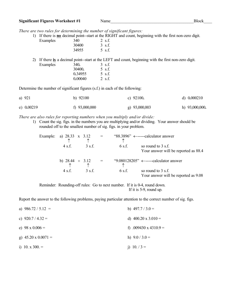 Significant figure worksheets typically present students with a set of problems, including calculations involving addition, subtraction, multiplication, and division. These problems may involve any combination of decimal numbers, scientific notation, and/or exponents. Through the use of these worksheets, students learn how to identify and properly use the appropriate number of significant figures in problem-solving.