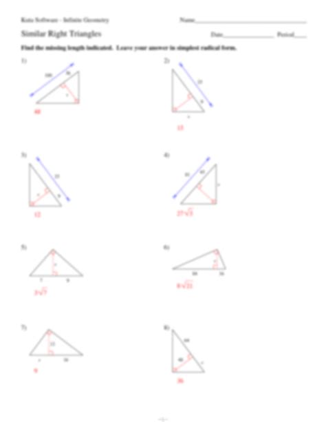 The worksheet provides students with an opportunity to explore the various properties of similar right triangles, including the relationship between side lengths, the angle measurements, and the corresponding area. By working through the problems on the worksheet, students will gain a better understanding of the properties of similar right triangles, as well as the equations that need to be used to solve related problems.