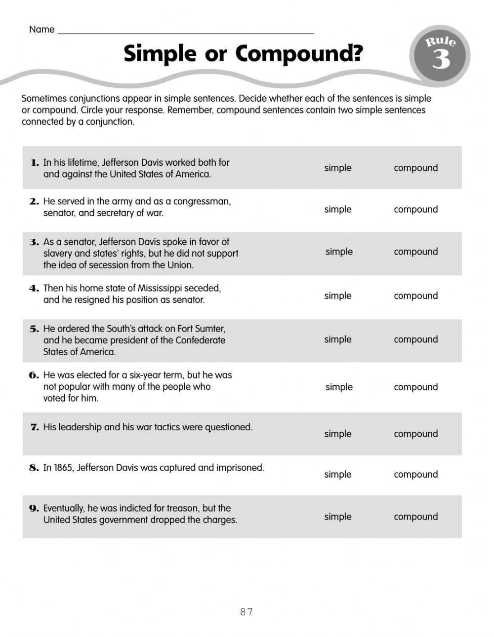 1. Review the definitions, explanations, and examples of simple, compound, and complex sentences provided on the worksheet.