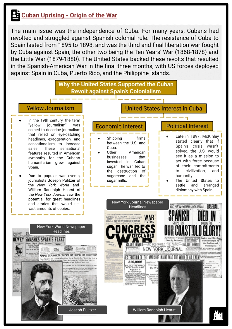One such activity would be to analyze primary sources from the period, such as newspaper articles, speeches, and documents. By examining the rhetoric and positions of the two sides, students can gain a better understanding of the issues at stake and how they led to the war. For example, in the 1898 article “The Duty of the United States” by William Mckinley, the President of the United States outlines his views on the situation in Cuba and why he believes the United States had a duty to intervene. This can be used to discuss the role of the United States in the conflict and how its actions contributed to the war.