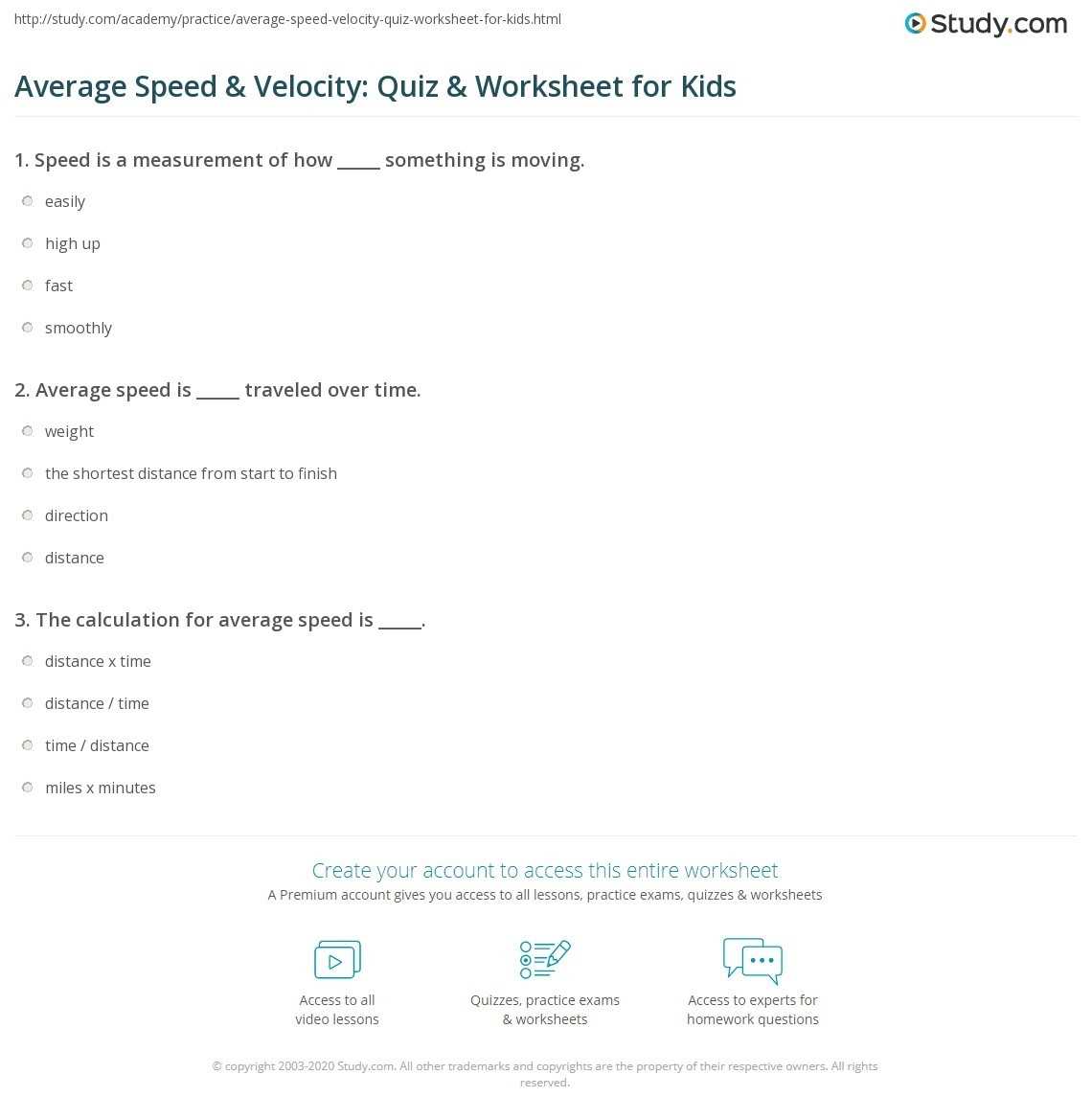 The worksheet contains a variety of questions that cover the concepts of speed, velocity, and acceleration. The questions are designed to help students become familiar with the different variables and equations that are used to calculate speed, velocity, and acceleration. For example, one question may ask students to identify the formula used to calculate the speed of an object at a given time. Other questions may ask students to calculate the acceleration of an object based on its speed and velocity.