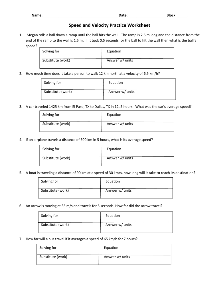 Speed and velocity worksheets are an effective way to develop problem-solving skills. These worksheets provide a structured environment for students to explore various concepts related to speed and velocity. Students must use their knowledge of the physical sciences to answer questions about the rate of speed and the direction and magnitude of velocity.