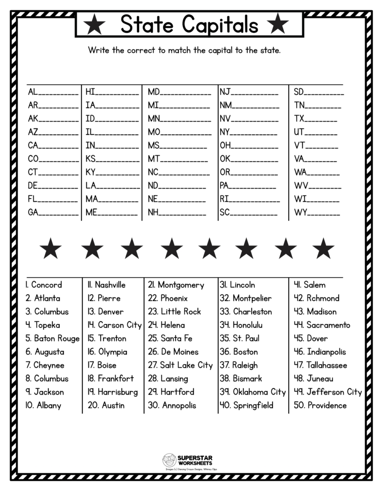 One of the primary benefits of utilizing a matching worksheet is that it allows students to practice their skills in an organized manner. By matching the states with their capitals, students will be able to quickly identify each state and its corresponding capital, and also practice their spelling and memorization of the names of each. Additionally, the use of a matching worksheet can help to reinforce the knowledge of states and capitals that students have already acquired.