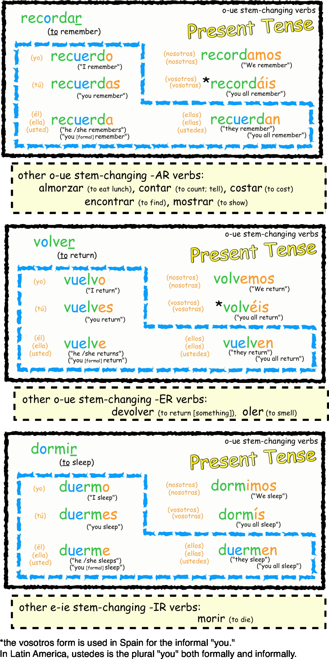 The o-ue stem-changing verbs are the least common and are used to express a change in physical position or movement. Examples of o-ue stem-changing verbs are: contar (to count), dormir (to sleep), and morir (to die).