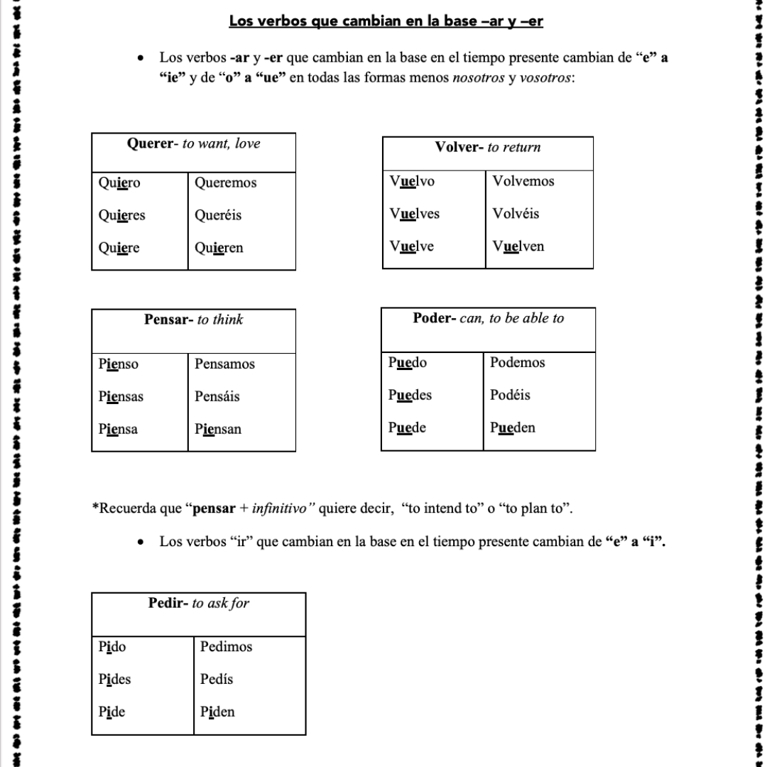 The worksheet begins with a brief explanation of stem-changing verbs and a list of the most common Spanish verb patterns that undergo such changes. Next, students will practice conjugating a variety of stem-changing verbs in the present tense. The verbs are listed in their infinitive form, and students must conjugate them in the first person singular, third person singular, and third person plural.